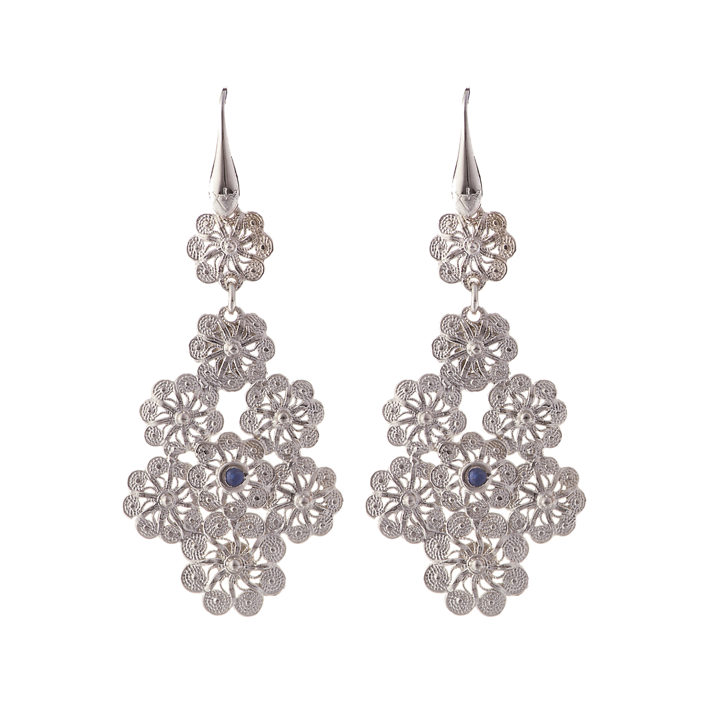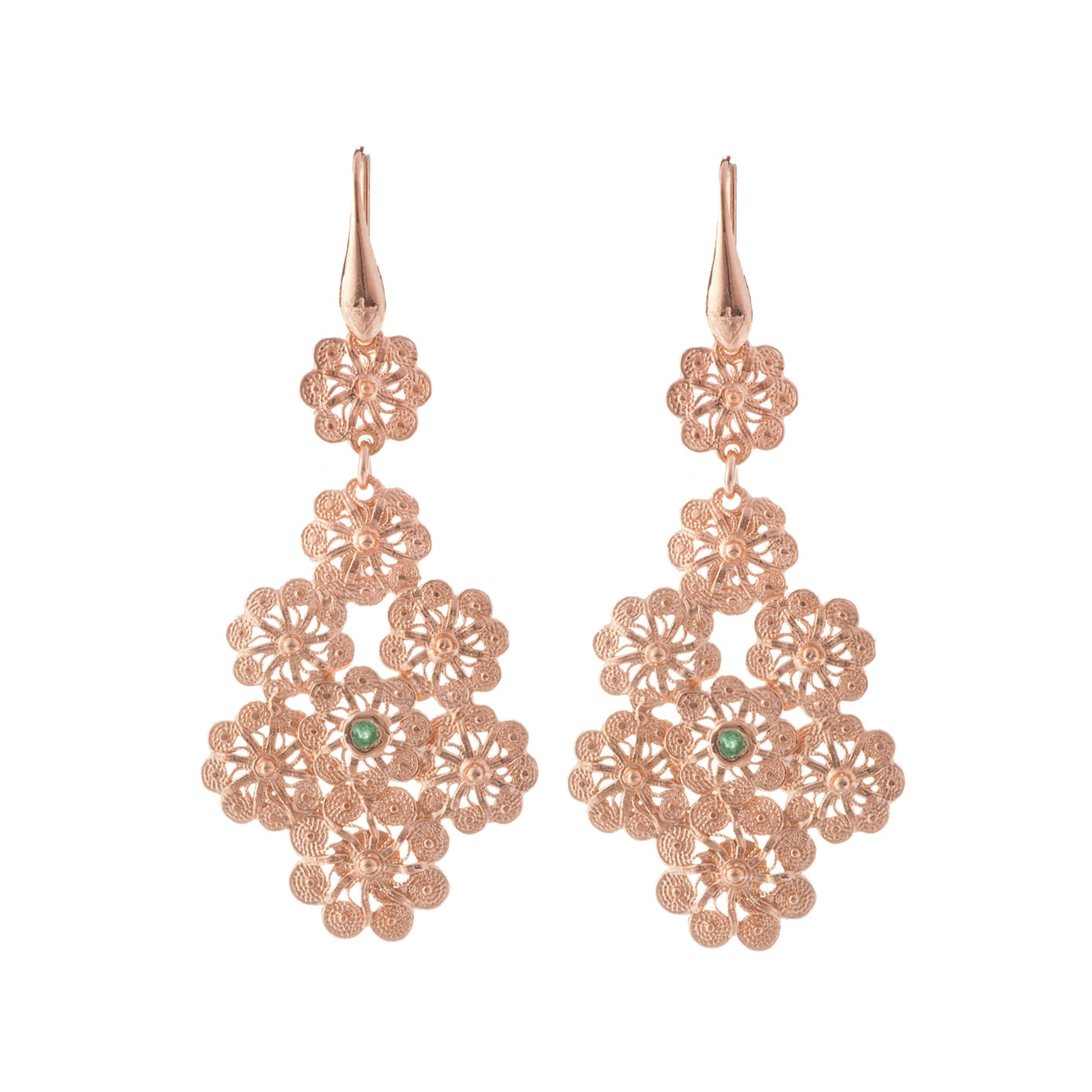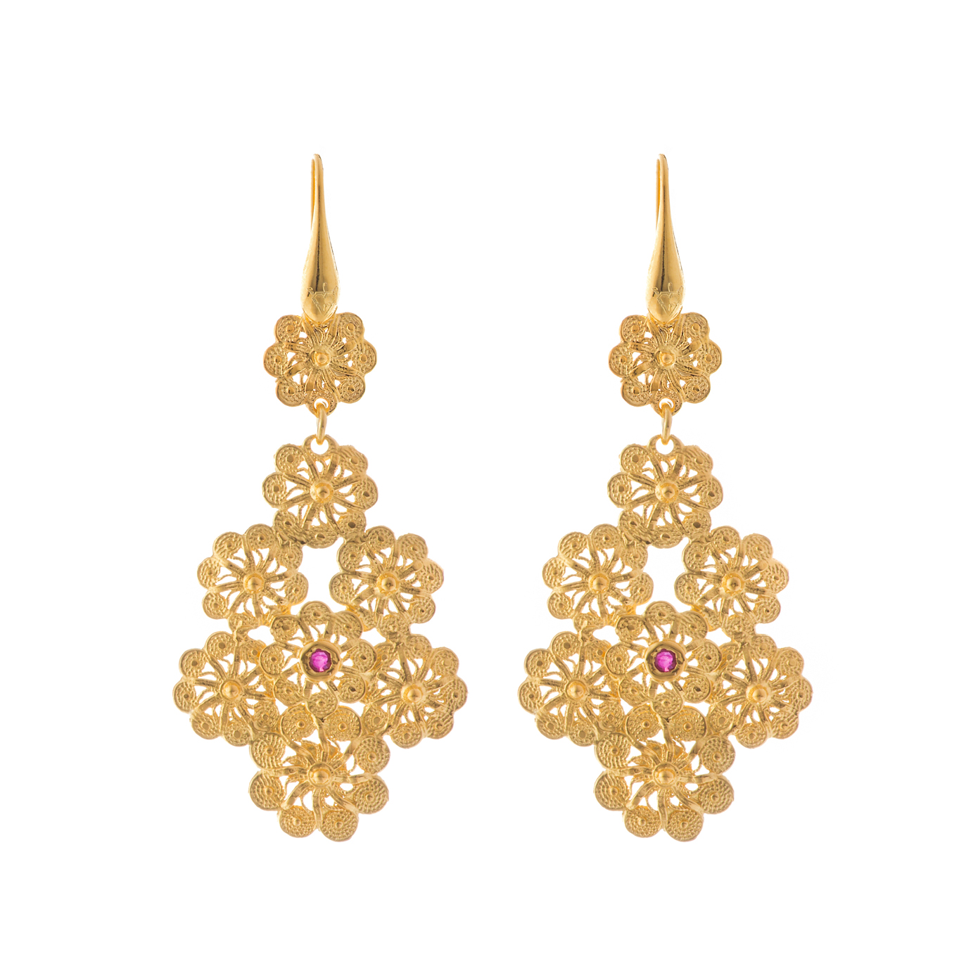 Rivisitazione moderna del chicco di Jennacca sangiovannese. Lavorazione artigianale in filigrana con più fiori arricchita da una pietra naturale centrale : rubino, zaffiro o smeraldo. Disponibile in quattro colorazioni diverse. Misura 75 mm